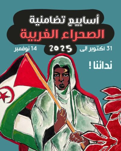 ندعو الجميع للمشاركة بمبادراتهم الخاصة في إطار أسابيع العمل التضامني من 31 أكتوبر إلى 14 نوفمبر: سواءً كانت عروض أفلام، فعاليات إعلامية، مناظرات، أنشطة ثقافية، حملات مناشير وملصقات، مظاهرات أو أي أشكال أخرى إبداعية وحاسمة تُعرّف بالقضية وبنضال الشعب الصحراوي في الأراضي المحتلة وفي المنفى.